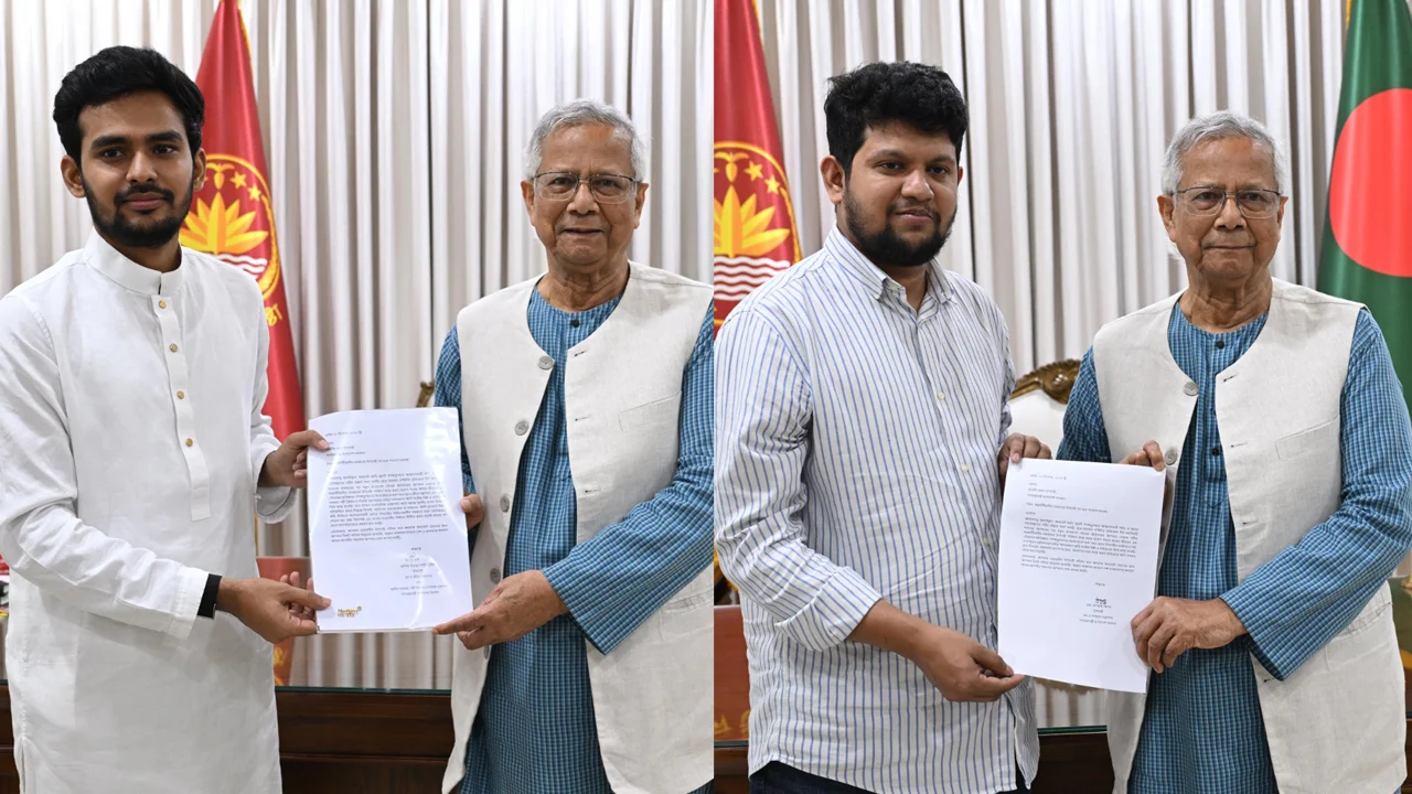 প্রধান উপদেষ্টা ড. মুহাম্মদ ইউনূসের কাছে পদত্যাগপত্র জমা দেন ক্রীড়া উপদেষ্টা আসিফ মাহমুদ ও তথ্য উপদেষ্টা মাহফুজ আলম। ছবি : আমার দেশ