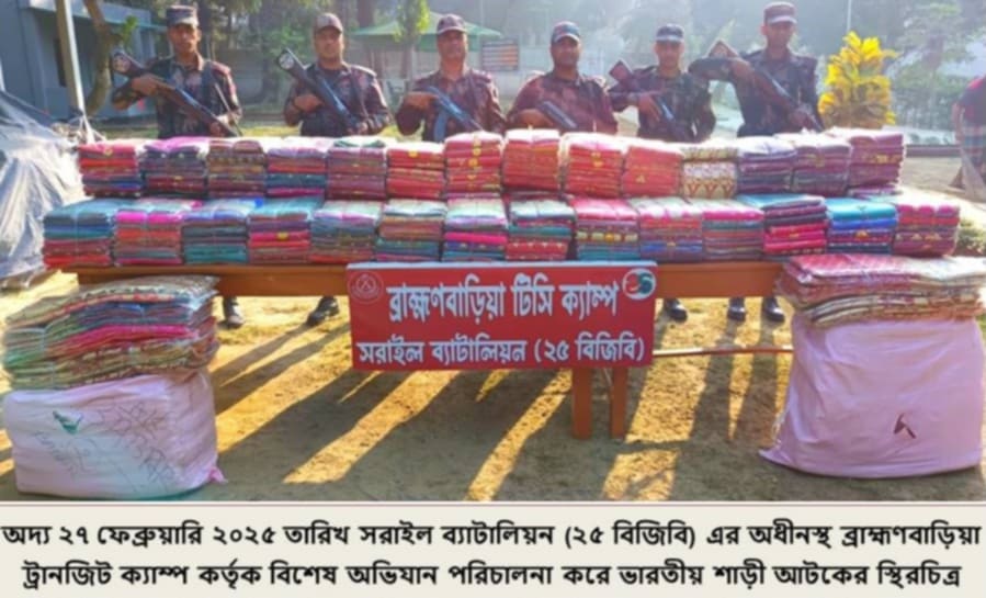 ব্রাহ্মণবাড়িয়া সরাইল ব্যাটালিয়ন (২৫ বিজিবি) ৬৫ লক্ষ টাকা মুল্যের ভারতীয় শাড়ী আটক
